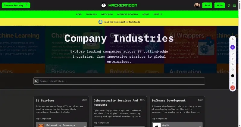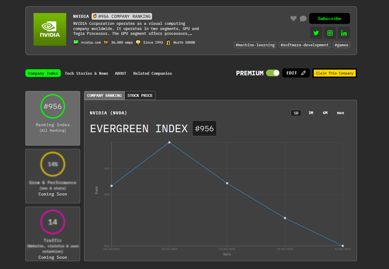 On industry-specific pages (e.g., web development), you can explore the full industry ranking, complete with each company’s stock prices, and related stories. Clicking a company card opens its Evergreen Tech Company Page, where you can react, subscribe, leave reviews and comments.