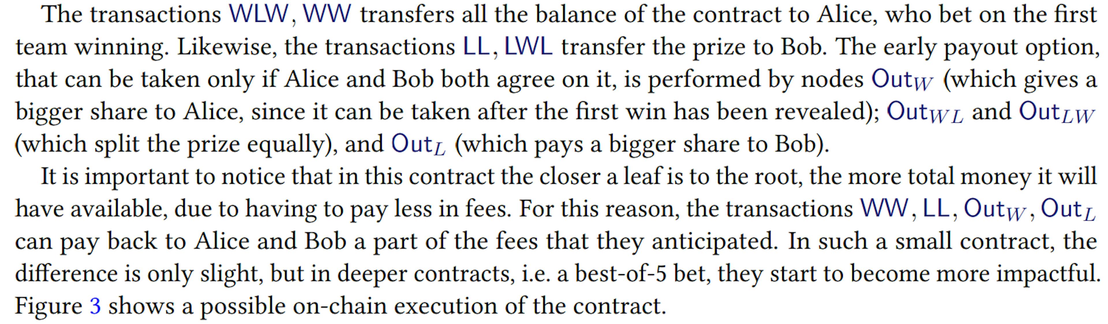 Example: Best-of-3 Bet We illustrate the on-chain execution of a contract through an example. The tree of transactions presented in Figure 2 implements a best-of-three bet between Alice and Bob, on some kind of recurring match between two teams. Before the competition starts, an oracle commits the hashes of six secret messages: three of them denote that the first team won a match, while the other three denote that it lost [1]. After each match the oracle certifies the victory or loss of the team by revealing the suitable secret message. These secrets can then be used by Alice and Bob to update the state of the contract, appending a new transaction to the blockchain. Transactions in the contract are