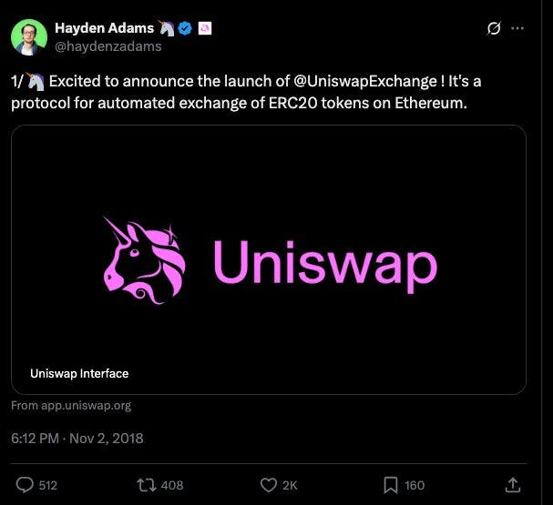 Back in 2018, Vitalik Buterin’s writings on “on-chain market makers” inspired Hayden Adams to create Uniswap. At the time, centralized exchanges like Coinbase dominated crypto trading, with high fees and KYC requirements. Uniswap introduced a new model: trustless, permissionless trading where users could become market makers by providing liquidity—a direct challenge to the CeFi status quo.