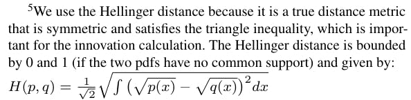 The individual’s payoff is calculated according to the distance they move the public pdf towards the true pdf. That is, the innovation (individual payoff) I generated by an individuals additional (n + 1)th sample is calculated with respect to the true pdf ptrue(x) and the current public pdf ppublic(x), based on the Hellinger distance H(p(x), q(x))[5], as follows: