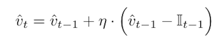 As noted above, individuals cannot foresee the true future value of their innovation options (they do not know what sample they will receive or how much value it will add. Instead, they can only estimate the relative values of innovation based on the previous rounds. Specifically, they update their belief about the options based on the previous full and truncated (AI) samples from the previous round (and a minimum of three), according to a learning rate (η) as follows. For the previous estimate vt−1, the new estimate vt for each of the full- and truncated-samples is calculated from the observed value in the previous round (It−1) as