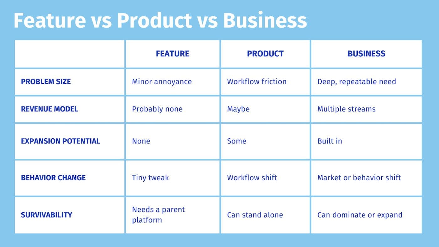 If you are building a feature, it solves a tiny pain, maybe improves a workflow, but it is not strong enough to stand alone.