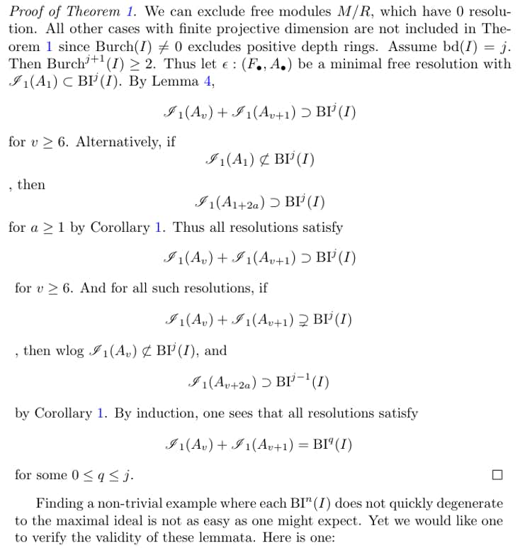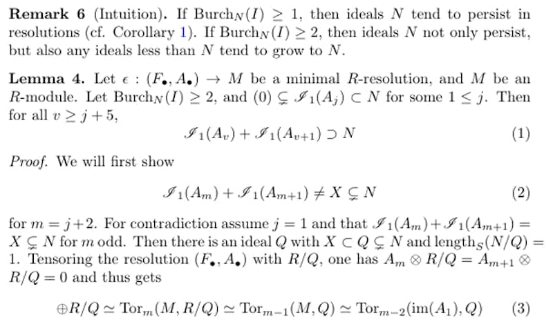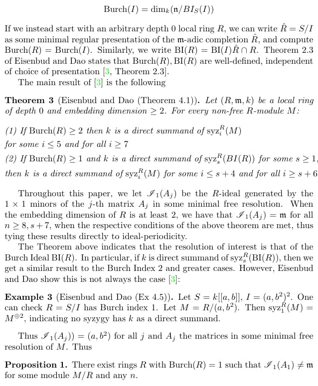 [1] Maurice Auslander and David A Buchsbaum. “Homological dimension in local rings”. In: Transactions of the American Mathematical Society 85.2 (1957), pp. 390–405. [2] Michael K Brown, Hailong Dao, and Prashanth Sridhar. “Periodicity of ideals of minors in free resolutions”. In: arXiv preprint arXiv:2306.00903 (2023). [3] Hailong Dao and David Eisenbud. “Linearity of free resolutions of monomial ideals”. In: Research in the Mathematical Sciences 9.2 (2022), p. 35. [4] Hailong Dao, Toshinori Kobayashi, and Ryo Takahashi. “Burch ideals and Burch rings”. In: Algebra & Number Theory 14.8 (2020), pp. 2121–2150. [5] David Eisenbud. “Homological algebra on a complete intersection, with an application to group representations”. In: Transactions of the American Mathematical Society 260.1 (1980), pp. 35–64. [6] Juan Elias et al. Six lectures on commutative algebra. Vol. 166. Springer Science & Business Media, 1998. [7] Vesselin N Gasharov and Irena V Peeva. “Boundedness versus periodicity over commutative local rings”. In: Transactions of the American Mathematical Society 320.2 (1990), pp. 569–580. [8] Daniel R. Grayson and Michael E. Stillman. Macaulay2, a software system for research in algebraic geometry. Available at http://www2.macaulay2.com.This paper is