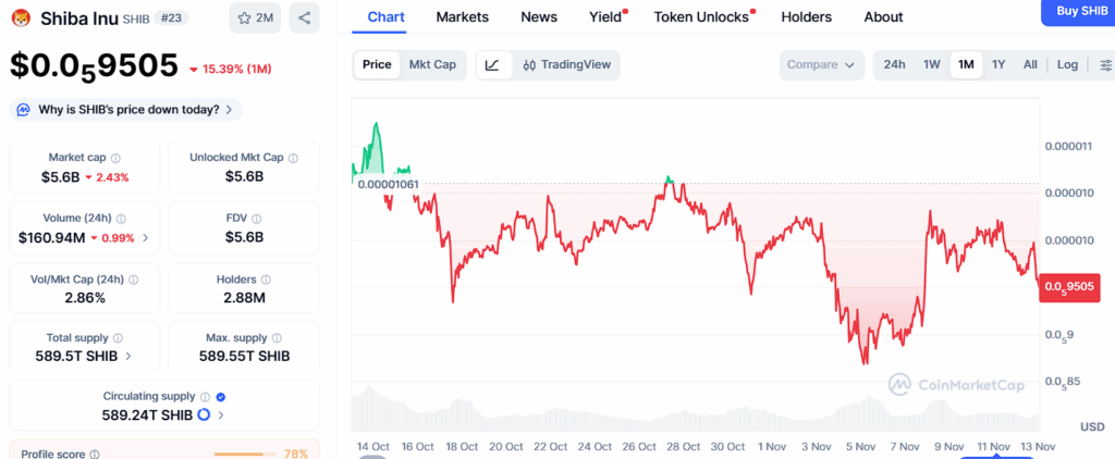 Shiba Inu (SHIB) continues to be a dominant force in the meme category, backed by one of crypto’s largest communities. Trading at $0.000009505, SHIB benefits from strong support zones and reliable liquidity.