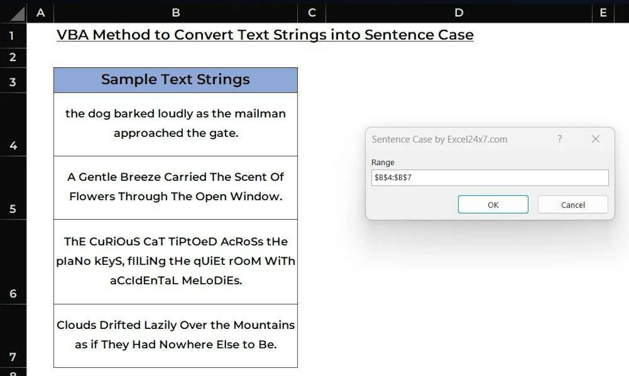 In Excel, you can easily convert the text string into Sentence Case and it will helps you to read and engageable. While Excel doesn’t have a built-in “sentence case” function, you can achieve this formatting using a custom formula. In this tutorial, I will explain you the multiple methods to convert a text string into a sentence case format in Excel using Formula and VBA codes.