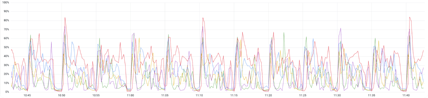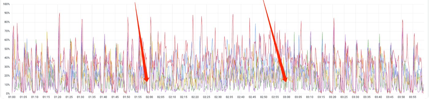 Later, they found that every time the 5-minute interval triggered, the CPU load on ECS machines spiked from below 5% to 100%, lasting for several seconds.