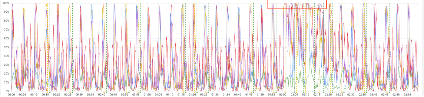 Afterward, they observed the CPU usage again and found that during the 5-minute triggers, the CPU stayed stable.Even at 2 AM and 3 AM, when a burst of tasks was scheduled, the CPU remained under control and tasks ran smoothly, as shown in the images: