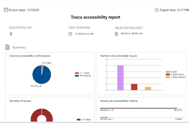 Finding 11 critical issues seems pretty concerning! To look more deeply, you can export the a11y report. You can even choose what standards Tosca should report against:
