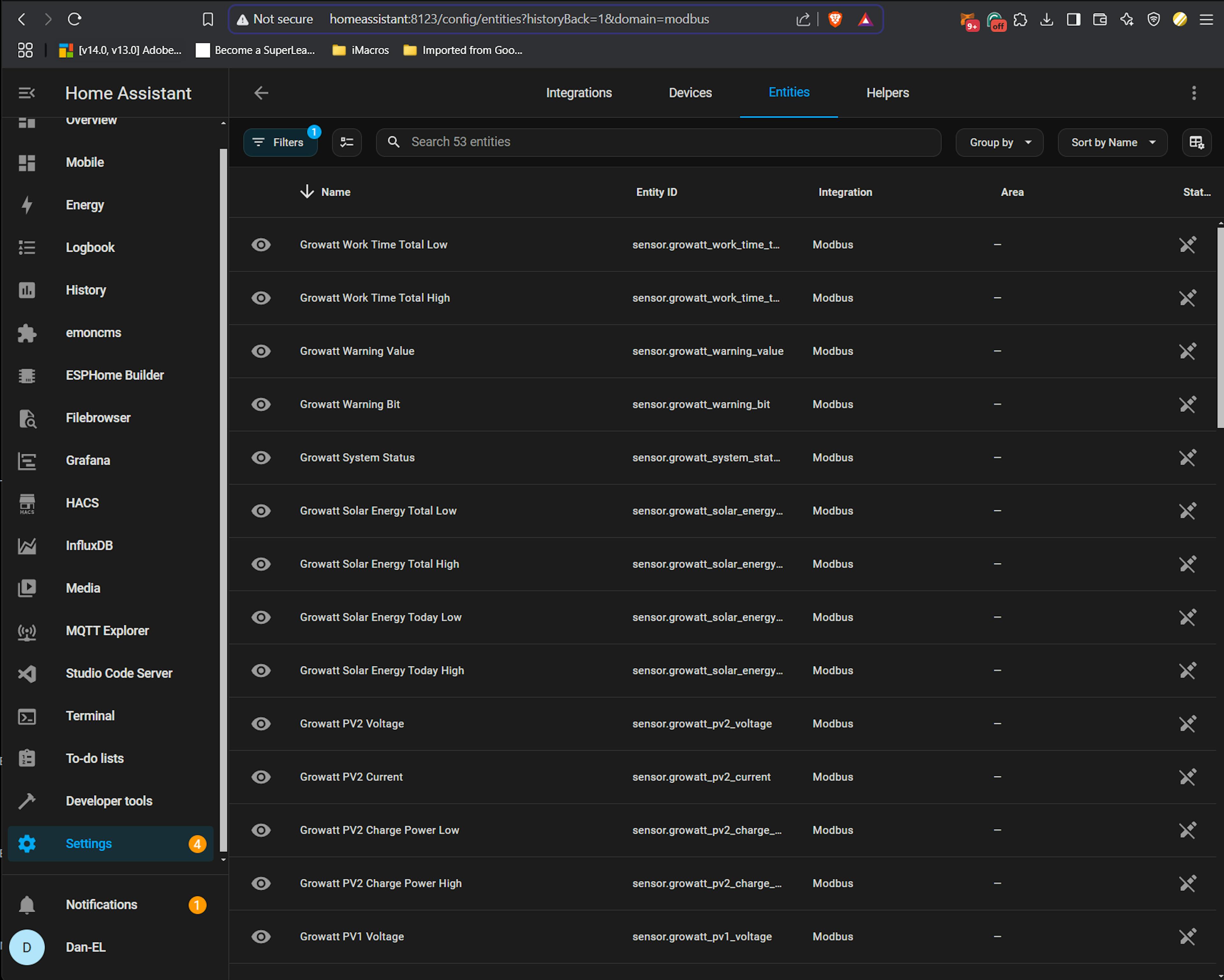 Now the Modbus sensor entities we created should be showing up in Home Assistant. You can confirm by going to the Entities tab in Home Assistant and filtering by Modbus integration or you search “Growatt” there.