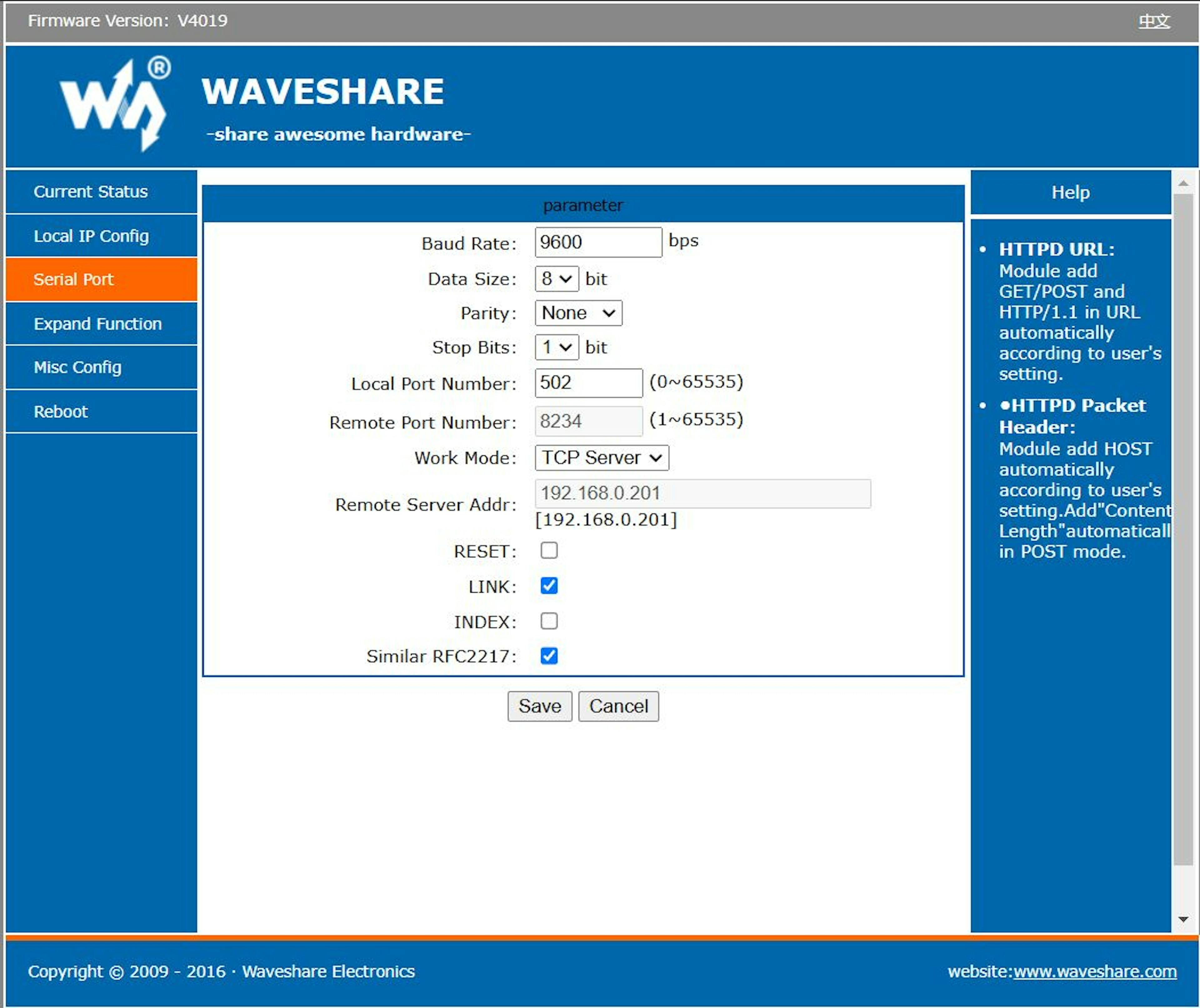 Now we are done with all physical connections, let’s go to the Waveshare IP. Click on the Serial Port tab. Change the Work Mode to TCP Server. Baud Rate to 9600, Data Size to 8, Parity to None, Stop Bits to 1, Local Port Number to 502. Then save and restart.